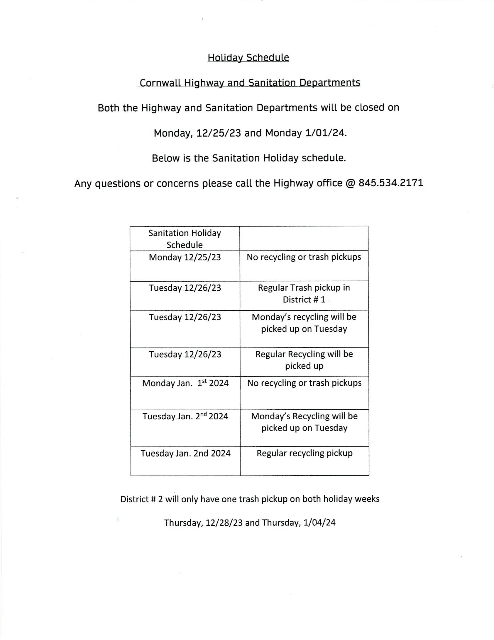 9 January MLK Holiday Pickup Schedule January 9, 2023 By Denise Provnick General 0 The Highway and Sanitation Departments will be closed on Monday, January 16th in observance of Martin Luther King Day. There will be no trash or recycling pickups on that day. Recycling will have to be held for pick up on the following Monday, January 23rd. District 2 will only have trach pickup on Thursday of that week, January 19th. Any questions or concerns please call the Highway Dept. @ 854.534.2171, sorry for any inconvenience. Related Articles Holiday Pickup Schedule Trash & Recycling will be picked up on Friday, 12/23/22 as normally scheduled. The Highway and Sanitation Departments will be closed on Monday, 12/26/22 and Monday, 1/2/23. There will be NO trash or recycling pickup on these days. District 2 will only have one trash pickup on Thursday, 12/29/22 and Thursday, 1/5/23 Recycling for District 1 who normally have recycling pickup on Mondays, will have a recycling pickup on both Tuesday, 12/27/22 and Tuesday, 1/03/23. District 1 has no change in trash pickup, it will be as normally scheduled. Thanksgiving Holiday Pickup Schedule The Highway and Sanitation Departments will be closed for the Thanksgiving Holiday, both Thursday and Friday, November 24th & 25th. There will be no trash or recycling pickups on those days. Recycling will have to be held for pick up the following week. Both districts will only have one trash pickup, Monday for District 2 and Tuesday for District 1. Any questions or concerns please call the Highway Dept. @ 845.534.2171. Sorry for any inconvenience. Holiday Pickup Schedule for Christmas and New Year's Day Holiday Pickup Schedule for Christmas and New Year's Day 2024 Holiday Trash & Recycling Pickup Schedule 2024 Holiday Trash & Recycling Pickup Schedule Labor Day Holiday Pickup Schedule The Highway and Sanitation Departments will be closed on Monday, September 5th, for Labor Day. There will be no trash or recycling pickups on that day. Recycling will have to be held for pick up the following Monday, September 12th. District 2 will only have trash pickup on Thursday of that week, September 8th. Any questions or concerns please call the Highway Dept. @ 854.534.2171, sorry for any inconvenience. Juneteenth Holiday Pickup Schedule The Highway and Sanitation Departments will be closed on Monday, June 19th in observance of Juneteenth. There will be no trash or recycling pickups on that day. Recycling will have to be held for pick up on the following Monday, June 26th. District 2 will only have trash pickup on Thursday of that week, June 22nd. Any questions or concerns please call the Highway Dept. @ 854.534.2171. Sorry for any inconvenience. Comments are closed.